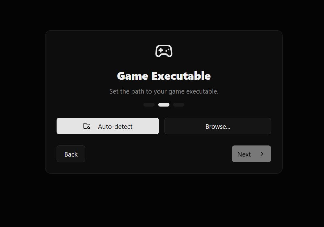After, you will be asked to select your game executable. Once again, click "Auto-Detect" if you have not modified this. Otherwise, select the location of your game executable.